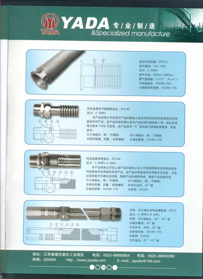 秉天時(shí) 籍地利 仰人和 虔誠(chéng)一個(gè)永恒的理念,創(chuàng)新永續(xù).百諾不如一信,亞達(dá)人堅(jiān)持以信為本,視客戶如同上帝,把對(duì)信譽(yù)的追求,體現(xiàn)在嚴(yán)格的質(zhì)量控制和完善的客戶服務(wù)上,讓客戶百分之百滿意是亞達(dá)人不變的信念。 本廠系ISO9001質(zhì)量認(rèn)證企業(yè)、計(jì)量合格企業(yè)。本廠專業(yè)致力于生產(chǎn)不銹鋼金屬波紋軟管、超高壓、高壓膠管、波紋管補(bǔ)償器(膨脹節(jié))、立式、臥式、冷卻器。本廠產(chǎn)品具有承受壓力高、彎曲半徑小、抗疲勞性能強(qiáng)、使用壽命長(zhǎng)等特點(diǎn)。廣泛應(yīng)用于電力、石化、冶金、水泥建材、工程機(jī)械、礦山及液壓系統(tǒng)。產(chǎn)品暢銷全國(guó)各地。 今日亞達(dá)之成功源自諸多客戶的厚愛,明天的輝煌更離不開您對(duì)我的支持與信賴。查看更多>>